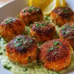 Delicious baked salmon meatballs served with a creamy avocado sauce, offering a rich blend of flavors and healthy ingredients.
