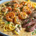 A rich and creamy Cajun shrimp and steak Alfredo pasta that brings together smoky spices with tender shrimp and steak for a delightful culinary experience.