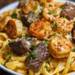 Savor the moment as you dive into a delightful bowl of Cajun Shrimp and Steak Alfredo Pasta. This exquisite dish dances vibrantly in the realm of comfort food, with its tantalizing blend of juicy shrimp and succulent steak, all embraced by a creamy, rich Alfredo sauce that envelops each strand of fettuccine. Just envision it: the first bite bursts with flavors, the warmth of Cajun spices igniting your taste buds, blended harmoniously with the lusciousness of garlic-infused cream and the savory notes of Parmesan. Each mouthful weaves together a tapestry of textures—from the chewy pasta to the tender steak and the perfectly tender shrimp, ensuring an unforgettable dining experience.