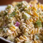 A vibrant and zesty pasta salad combining creamy dressing with tangy dill pickles and crisp vegetables, perfect for summer picnics.