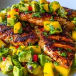 A vibrant summer dish featuring succulent grilled chicken topped with a refreshing mango and avocado salsa.