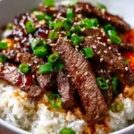 A vibrant and flavorful dish featuring tender marinated beef served over fluffy rice, garnished with green onions and sesame seeds.